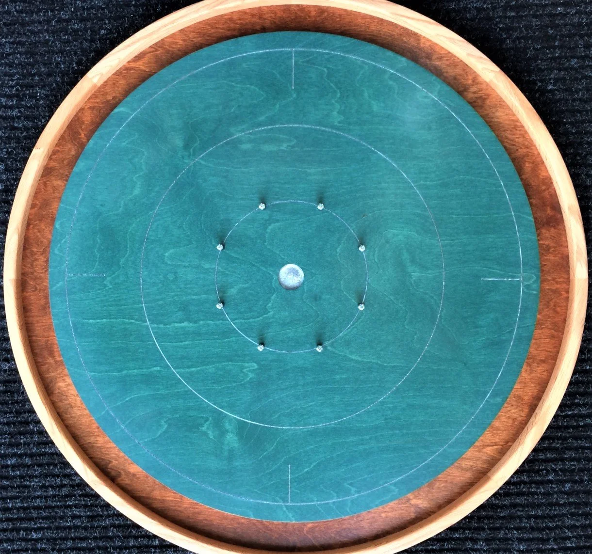 The reason we classify epoxy boards as premium is simple: they require more work and more materials. We take a board that is already stained and has its finish coats on it, and we rout out the circles (or the custom design the customer is asking for). Then we fill in the circles with either dyed epoxy or a product called InLace. After we fill it and it hardens, we sand it smooth.